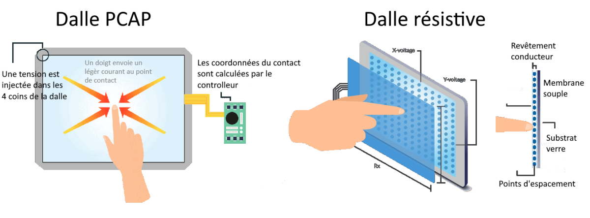 La dalle de technologie PCAP ( Projected Capacitive ) est capable de fonctionner en mode multipoints, ce qui permet par exemple une gestion de zoom de l'affichage avec plusieurs doigts. Les dalles PCAP fonctionnent maintenant avec un doigt ganté. La dalle de technologie résistive fonctionne avec une pression excercée sur la dalle. Elle est donc insensible aux pollutions ( eau, liquide, matière ) présentes dur la dalle. Cette technologie fonctionne parfaitement quel que soit les gants ou stylets utilisés.