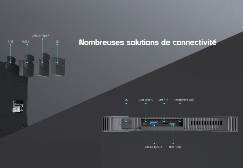 Performante, endurante et solide, la tablette G10P est architecturée autour du puissant processeur INTEL N5105. Elle dispose nativement de 2 ports USB ( 1 USB 3 / 1 USB 2) ainsi que d'un port Ethernet RJ45. En option, elle peut recevoir un module 4G / 5G ainsi qu'un lecteur de code barre HONEYWELL 1D/2D. Enfin, la batterie amovible et "Hot Swappable" de 5 000 mAh permet une usage sans interruption.