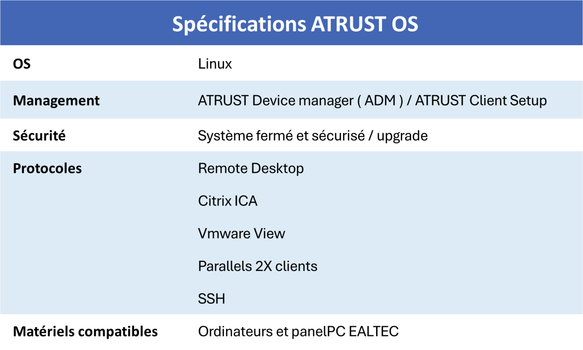 EALTEC est partenaire de la société ATRUST pour l'installation, la commercialisation et le support des solutions ATRUST OS, système d'exploitation innovant, sécurisé, fiable et performant de communications avec un serveur et compatible avec la grande majorité des protocoles de communications (RDP,CITRIX, VMWARE,.. ).
